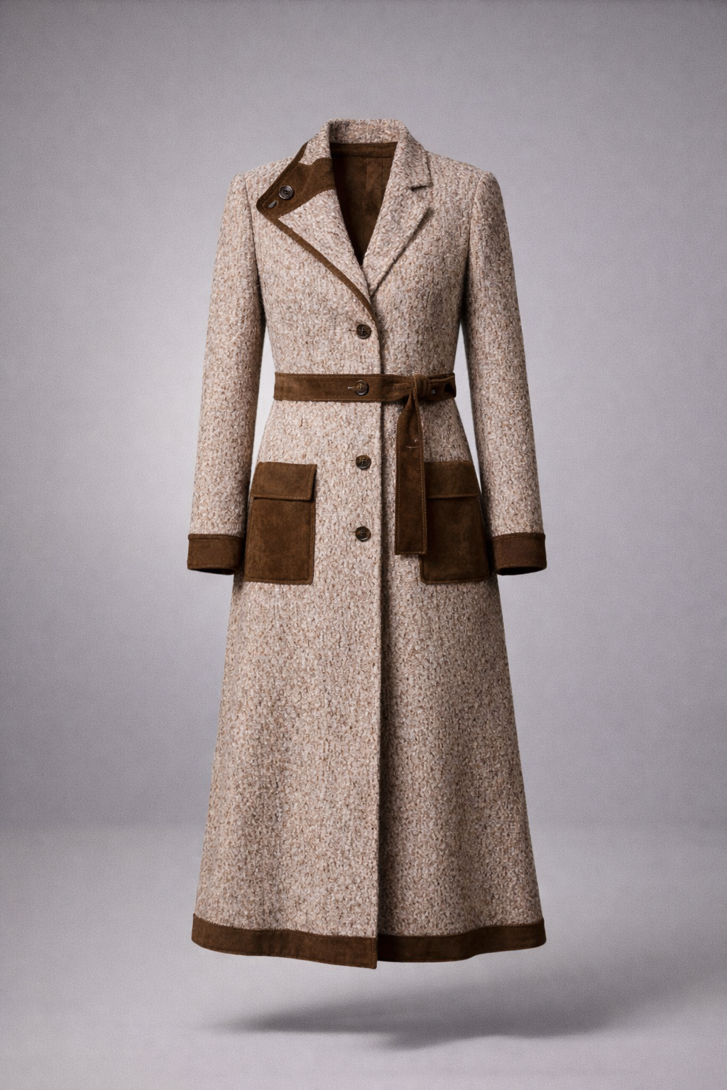 Crafted from 100% premium polyester with a wool-like texture, it offers refined structure, durability, and a beautifully tailored appearance. The contrasting details elevate the design, while the belted waist shapes the figure with balance and femininity. Its long, sculpted silhouette, wide lapel, and functional pockets make it the perfect coat for winter styling in cities like New York, Paris, and São Paulo.